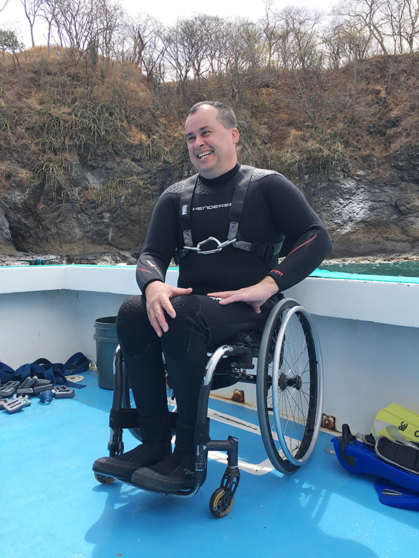 En mars 2023, Ariane Boisvert, Charles Valcourt et Natalia Bergeron, finissants du programme Arts, lettres et communication, option Vidéaste voyageur, ont accompagné Denis Laliberté au Costa Rica. Celui qui a perdu l’usage de ses jambes et qui se déplace en fauteuil roulant est un habitué des défis sportifs. Il n’avait toutefois jamais fait de plongée, un rêve pour lui.