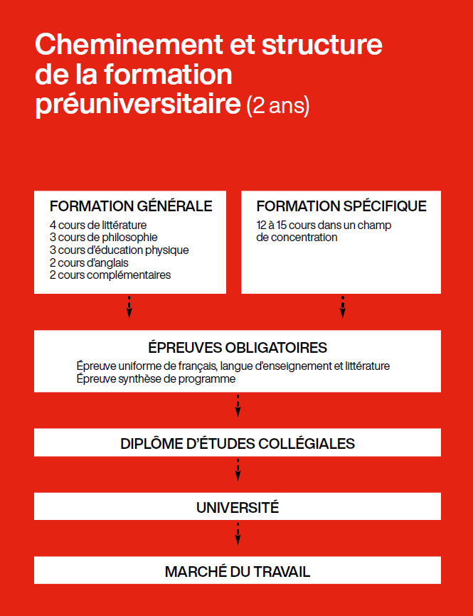 Si vous optez pour un programme préuniversitaire, c’est que vous envisagez probablement de poursuivre vos études à l’université. D’une durée habituelle de deux ans (quatre sessions), un programme préuniversitaire comprend une formation plus générale menant à l’obtention d’un diplôme d’études collégiales (DEC) et implique généralement la poursuite d’études universitaires. Il existe plusieurs choix de programmes : Sciences de la nature, Sciences humaines, Arts, lettres et communication, Histoire et civilisation et Arts visuels.