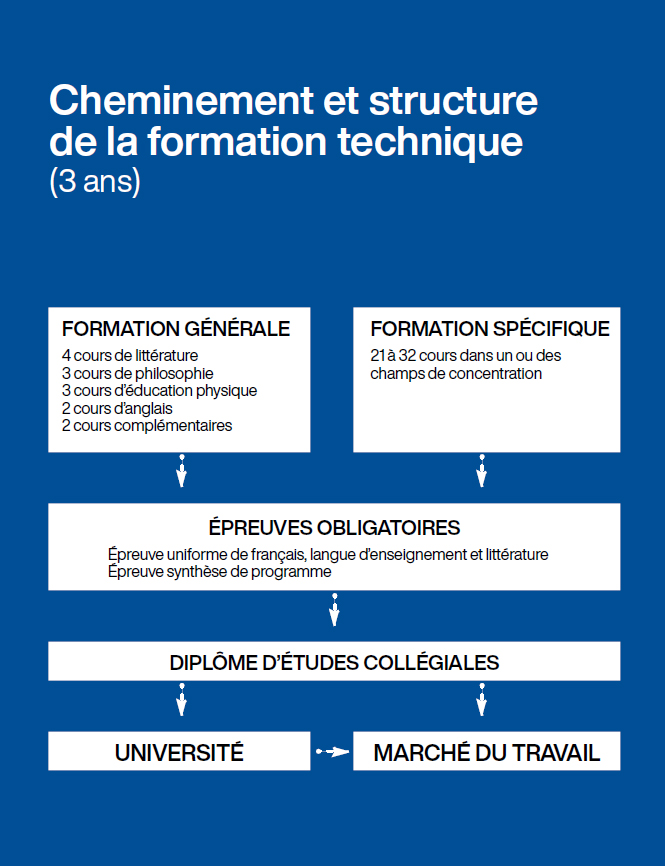 Un programme technique dure généralement trois ans (six sessions). Il comprend une formation plus spécifique, qui prépare principalement au marché du travail, mais aussi à la poursuite d’études universitaires. Certains programmes sont offerts en alternance travail-études. Cette formule peut vous sembler intéressante, car elle permet d’acquérir de l’expérience de travail pertinente à votre domaine d’études en effectuant un stage rémunéré durant l’été.