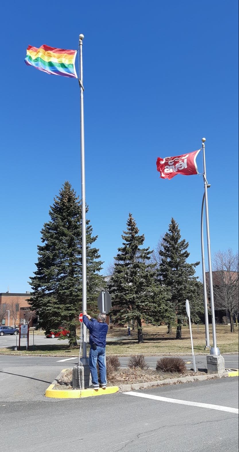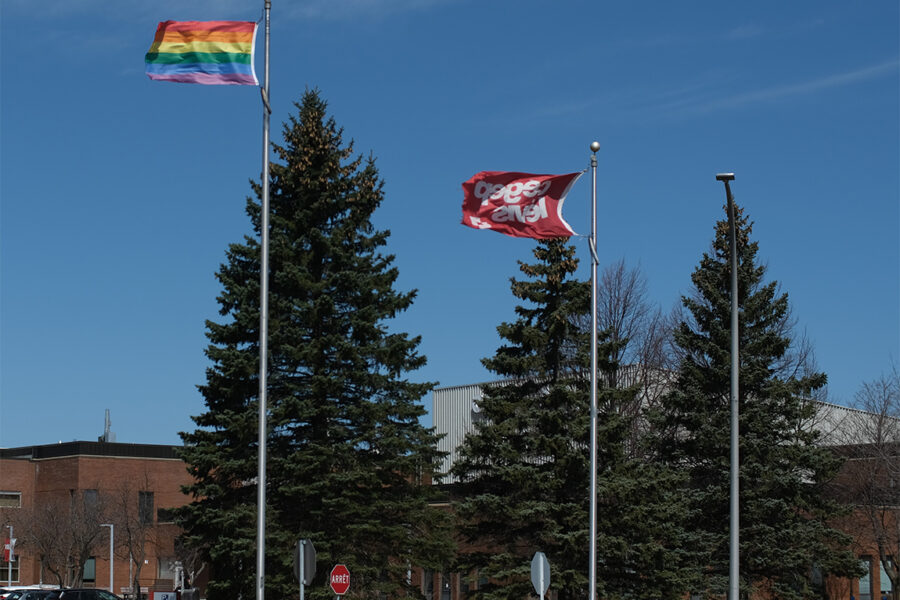 La réalisation de ce projet tombe à point et nous permet de souligner la Journée contre l’homophobie et la transphobie au collégial, ce samedi 17 avril (la journée officielle a lieu le 17 mai). Au cégep, un membre bien connu du personnel, Bertrand Pelletier, a hissé le drapeau emblématique de la communauté LGBTQ+. Denis Côté, agent de service social, était sur place pour capter les images.