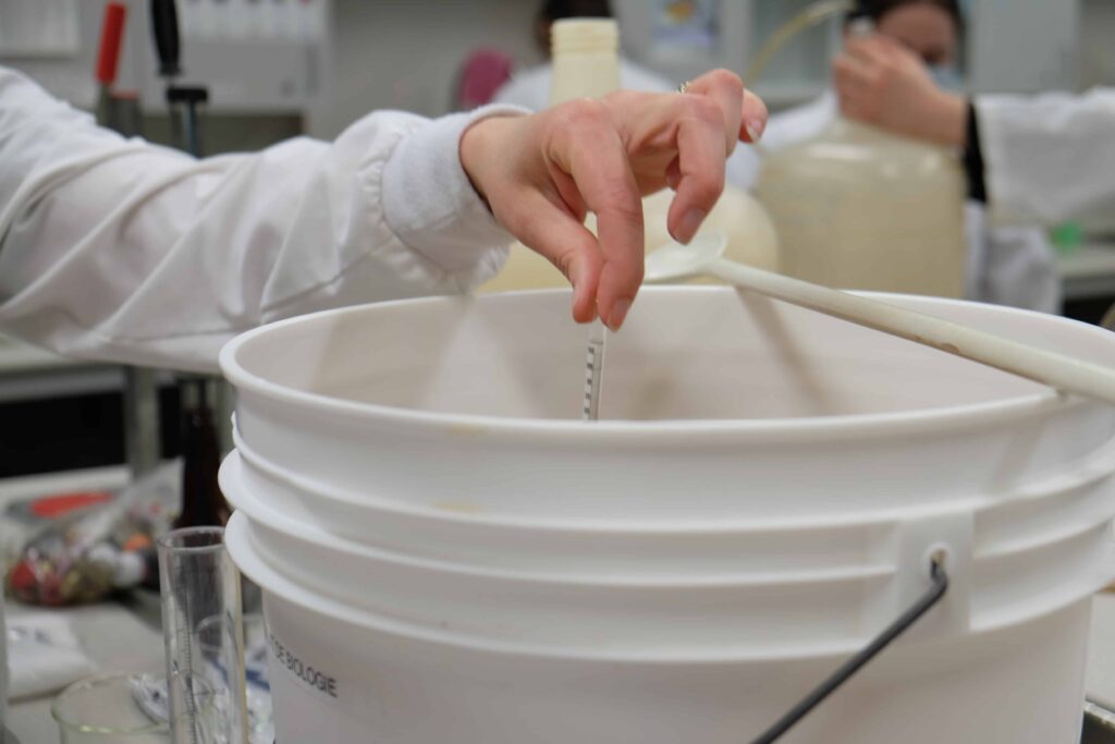 Le Département de biologie et de biotechnologie a créé un nouveau cours complémentaire intitulé Bières et autres fermentations : fabrication et dégustation. Cette session-ci, les professeurs Joannie Tremblay et Marc Cloutier le donnent à près de 60 étudiants, qui sont répartis en deux groupes. Ils ont déjà étudié le processus de fabrication du pain et de la bière. D’ici la fin des classes, ils auront l’occasion de faire du yogourt et du fromage.