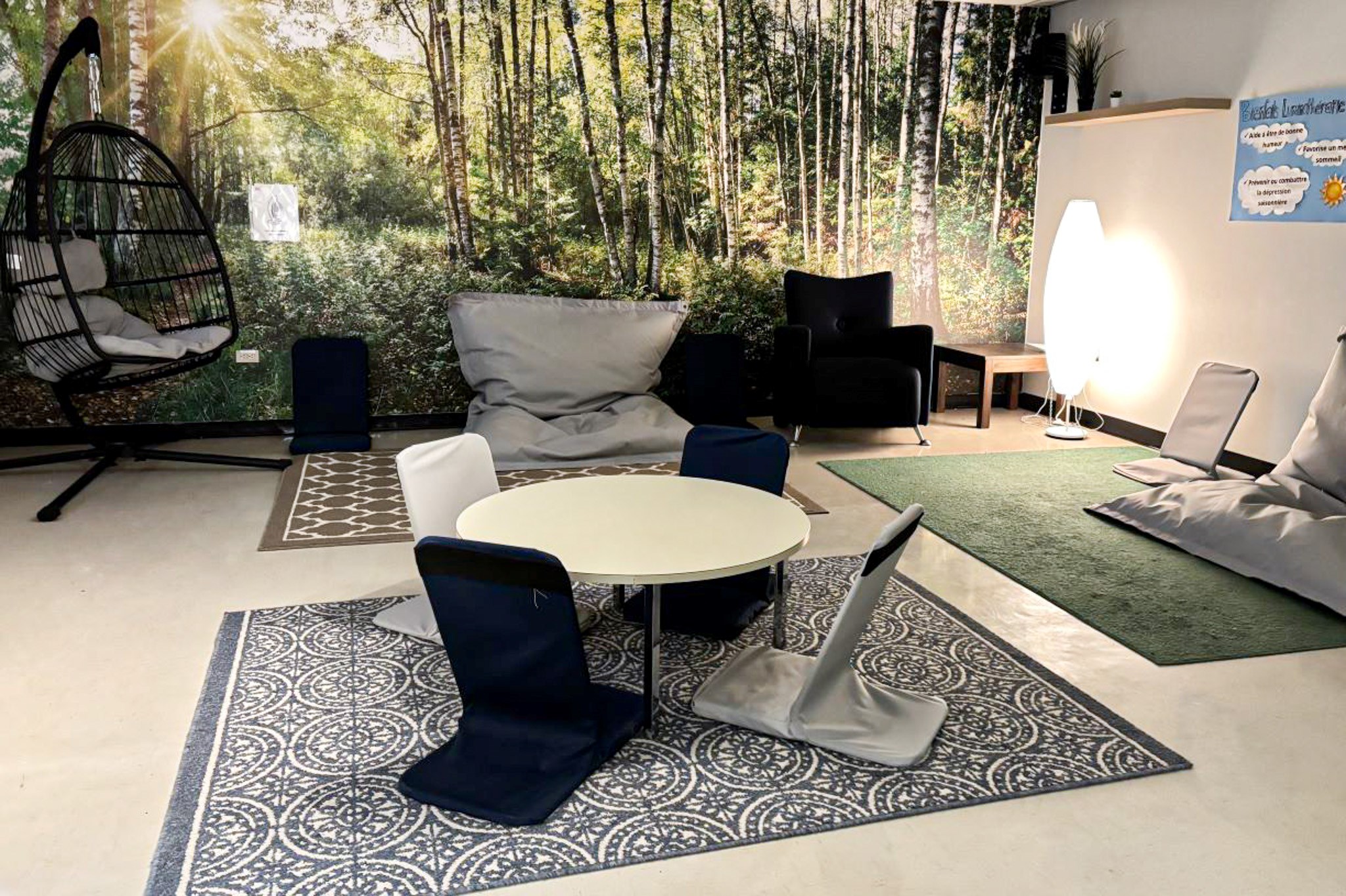 Un refuge pour la relaxation avec des zones dédiées au yoga, à la luminothérapie, au coloriage de mandalas et à la gestion du stress.