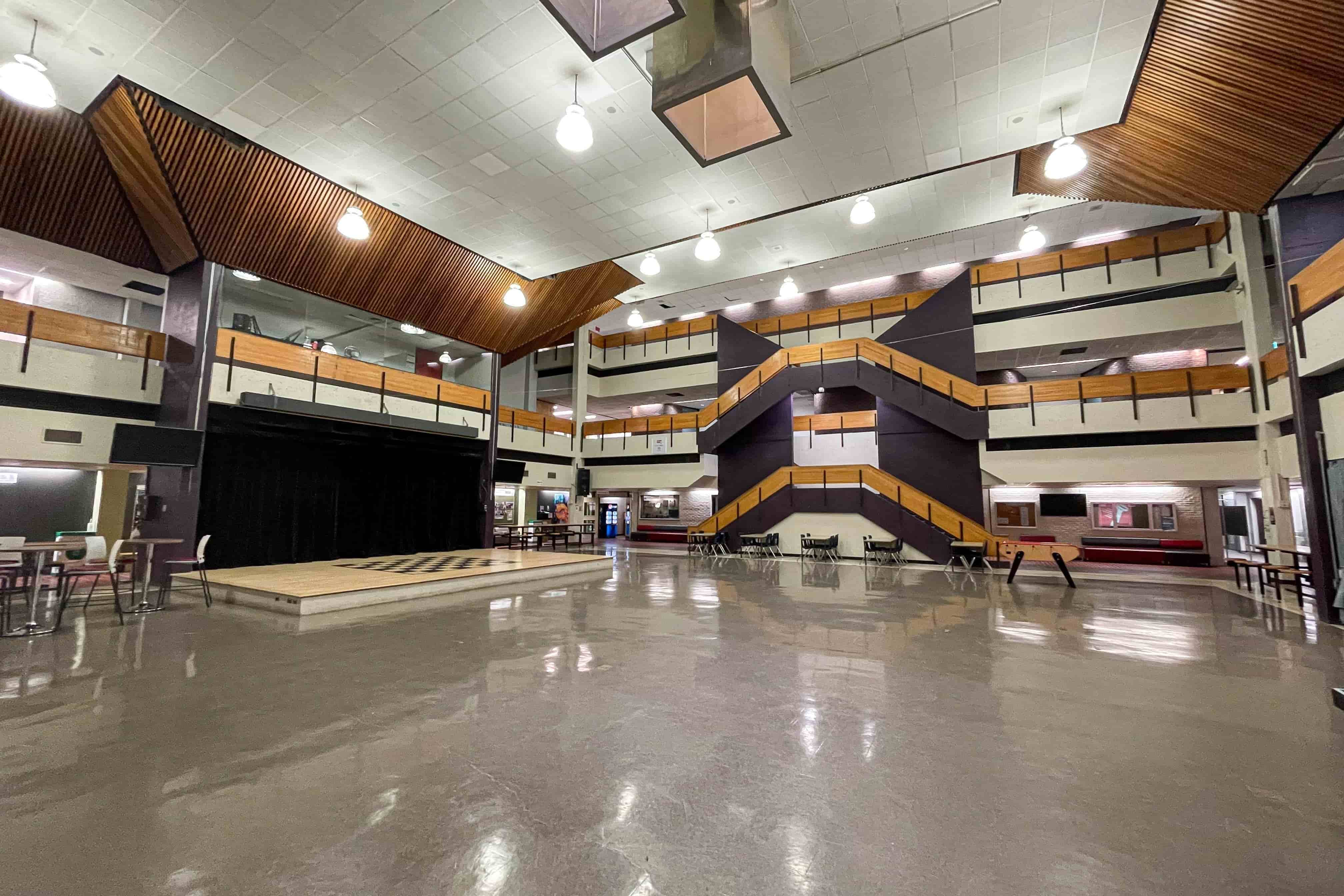 Situé en plein coeur du cégep, notre mail comprend une scène. Cet espace peut très bien être aménagé pour une soirée dansante.